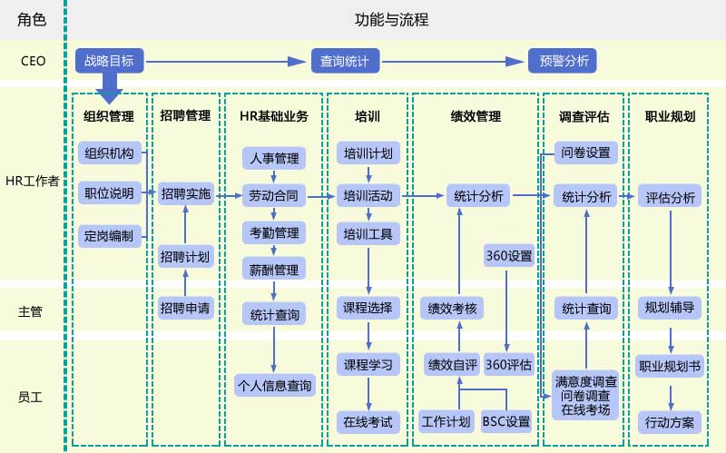 我们以企业HR战略管理(lǐ)价值為(wèi)出发点,将人力资源管理(lǐ)的各项职能(néng)整合在起的协同运作平台。主要包括组织管理(lǐ)、人事管理(lǐ)、薪酬管理(lǐ)、绩效管理(lǐ)、招聘管理(lǐ)、考勤休假管理(lǐ)、在線(xiàn)考场、HR调查、360度评估以及培训管理(lǐ)、职业发展规划等功能(néng)模块,还拥有(yǒu)工作流、提醒、预警等神经机制,為(wèi)企业的各级管理(lǐ)者提供实时动态HR信息及数据分(fēn)析,满足企业人力资源信息化的基本要求;為(wèi)HR规划、薪酬福利管理(lǐ)、绩效管理(lǐ)、人员优化配置等关键环节提供信息化管理(lǐ)工具,帮助企业HR工作者更好地為(wèi)企业培训优秀的员工队伍,提升企业的组织能(néng)力。